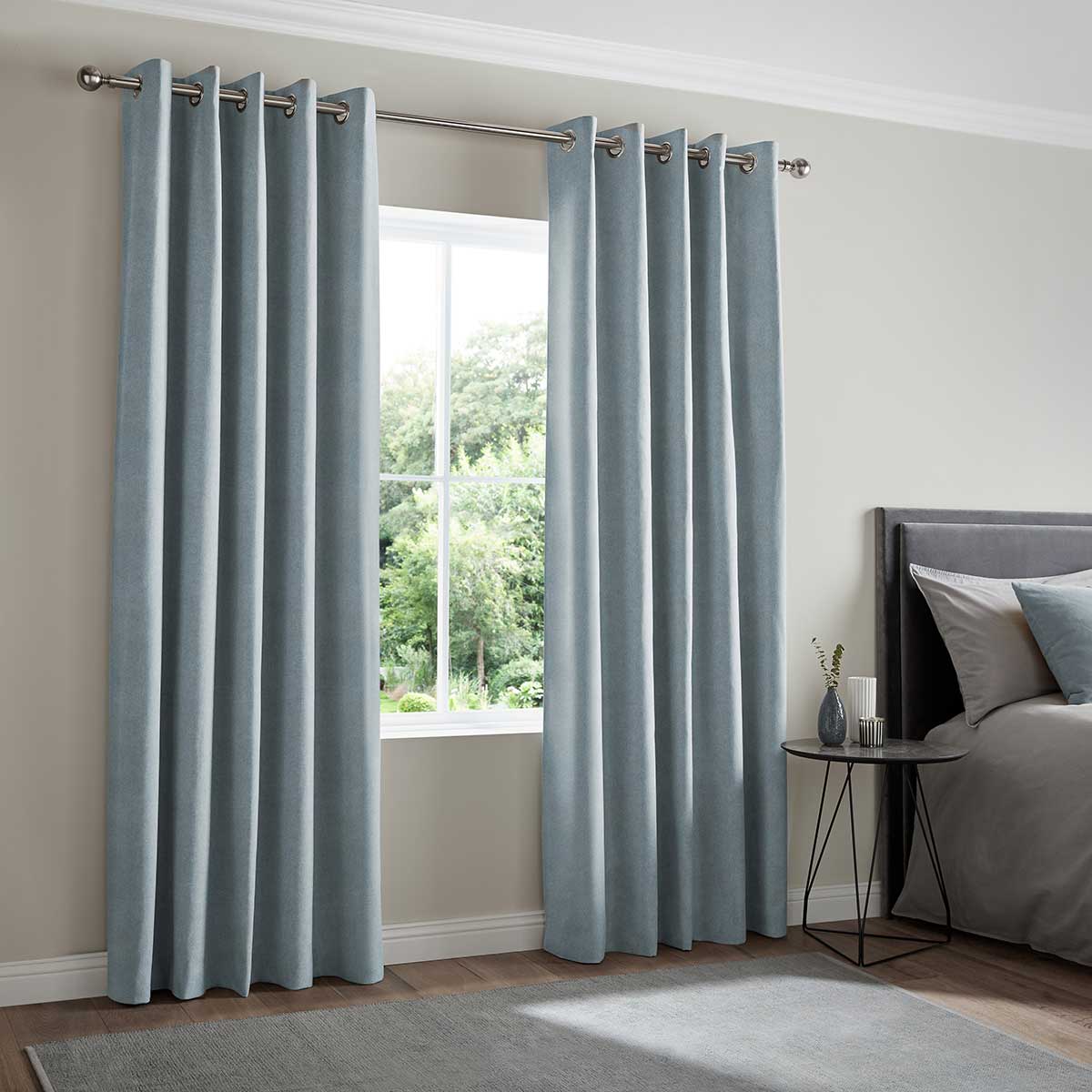 Eyelet - Eyelet curtains can only be fitted to poles. They have a metal ring stamped into the top of the fabric available in 5 colours and 2 sizes. Eyelet rings are spaced evenly across the header with 30mm of fabric above.