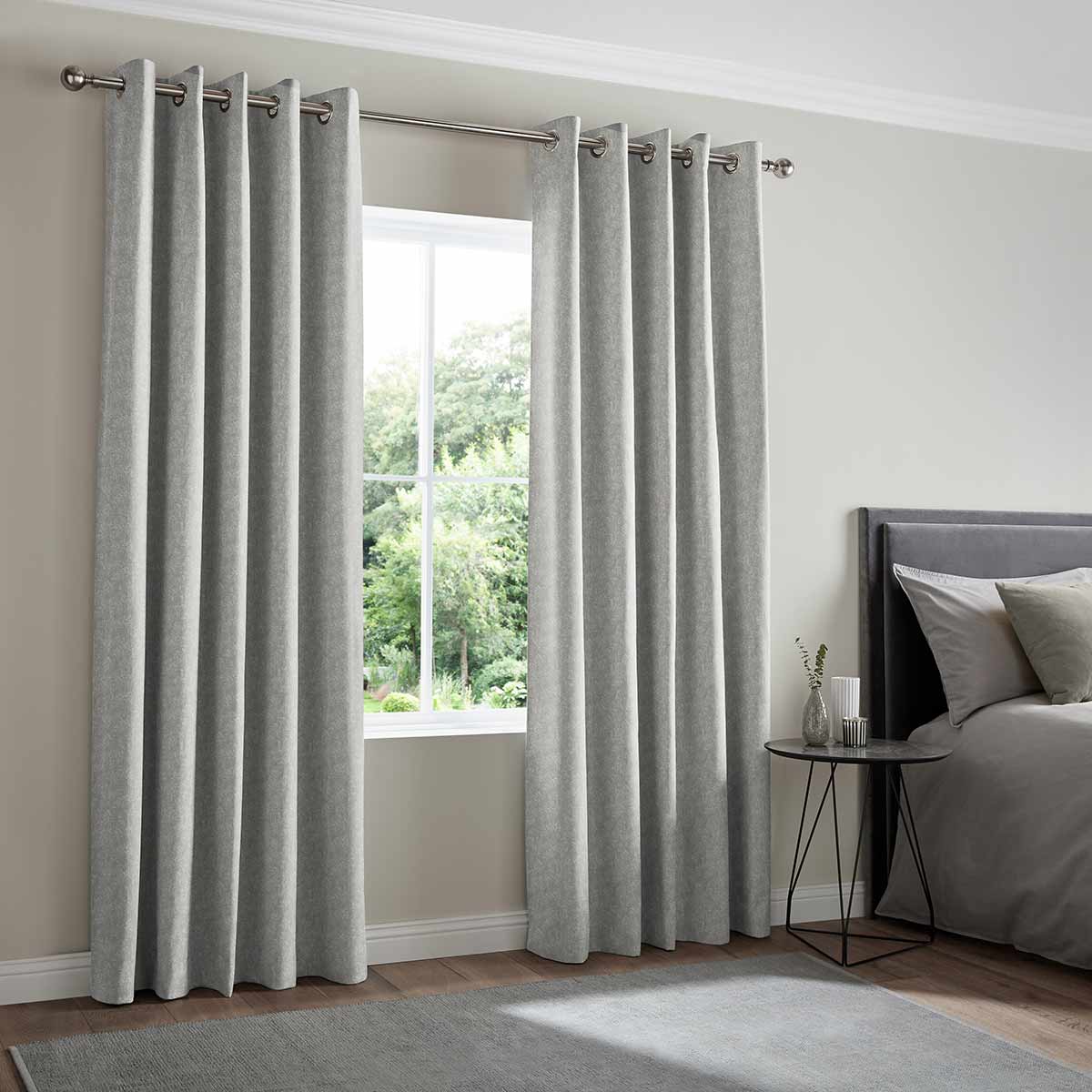 Eyelet - Eyelet curtains can only be fitted to poles. They have a metal ring stamped into the top of the fabric available in 5 colours and 2 sizes. Eyelet rings are spaced evenly across the header with 30mm of fabric above.