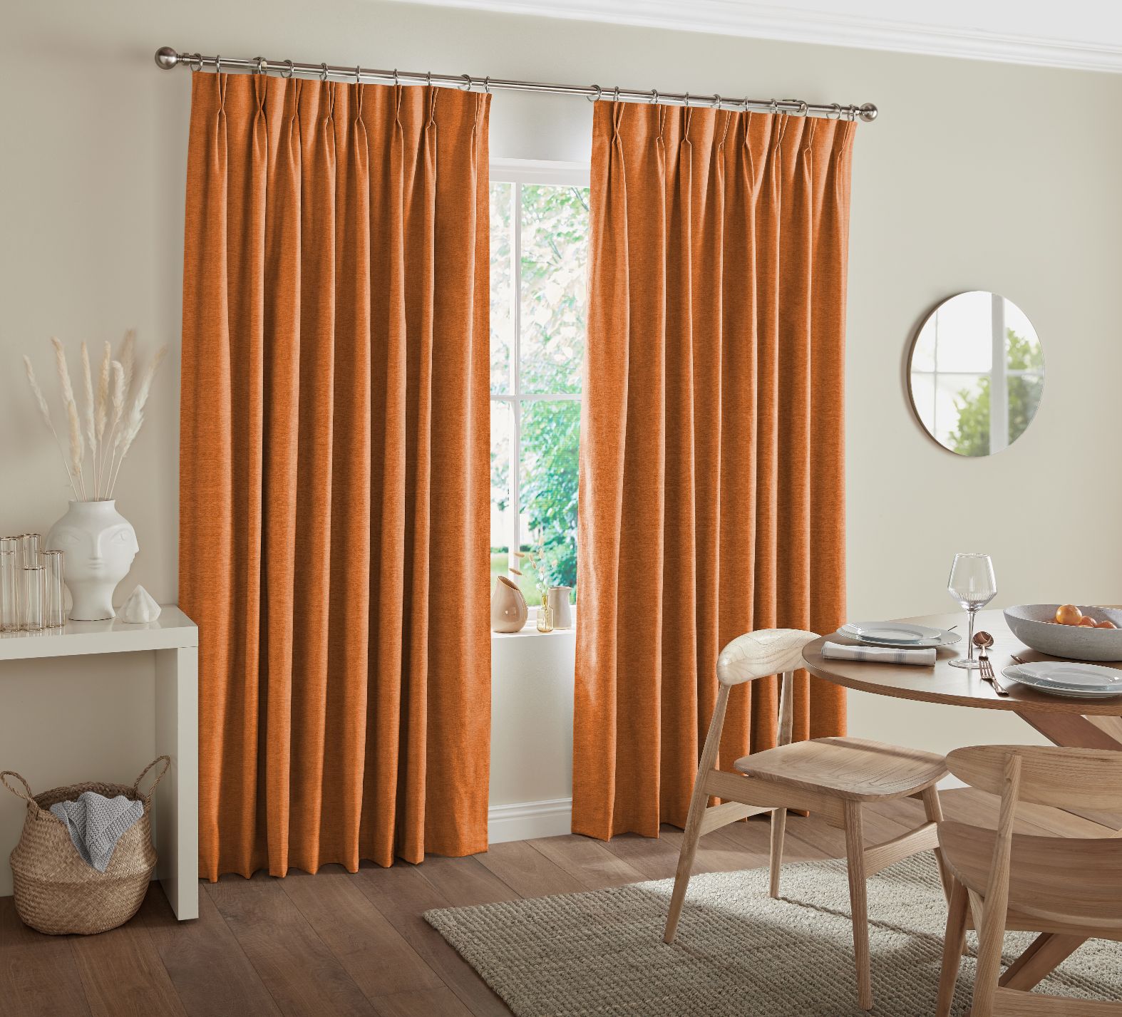 Featuring an embossed pattern with a subtle yet eye-catching sheen, this 100% polyester fabric has an autumnal orange hue that is ideal for creating a warm and cosy feel in any room.