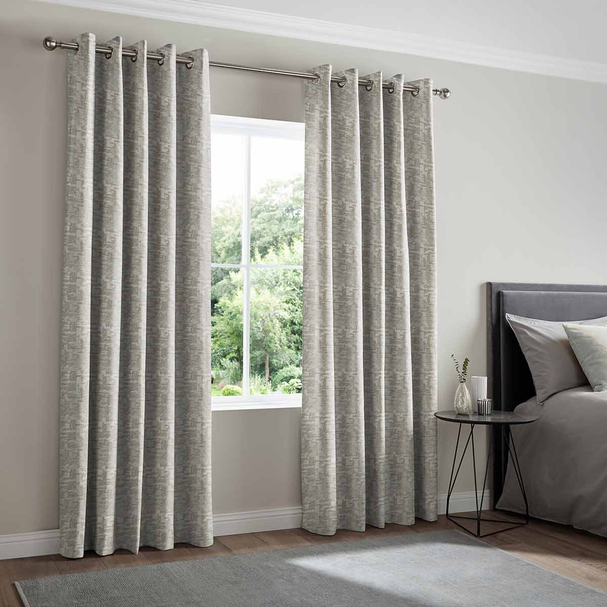 Eyelet - Eyelet curtains can only be fitted to poles. They have a metal ring stamped into the top of the fabric available in 5 colours and 2 sizes. Eyelet rings are spaced evenly across the header with 30mm of fabric above.