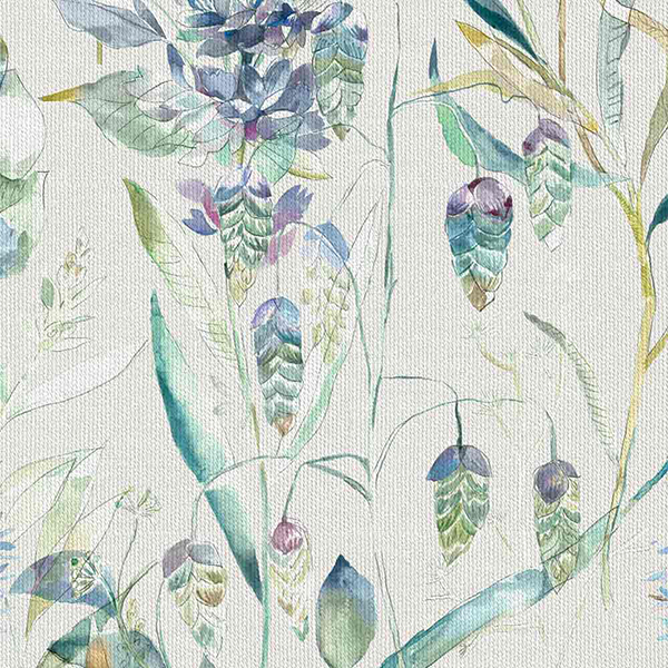 This design features a wide array of sketched flowers in a soft watercolour style that uses cooling blue and purple tones that can create a calm and serene space in any room.