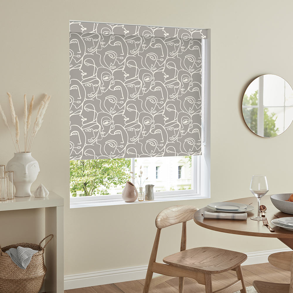 Enrich your room with this stylish geometric roller blind in grey colour. The simple design looks clean and tidy on any window and is available in multiple base clothes to choose from. Made with soft cotton and linen.