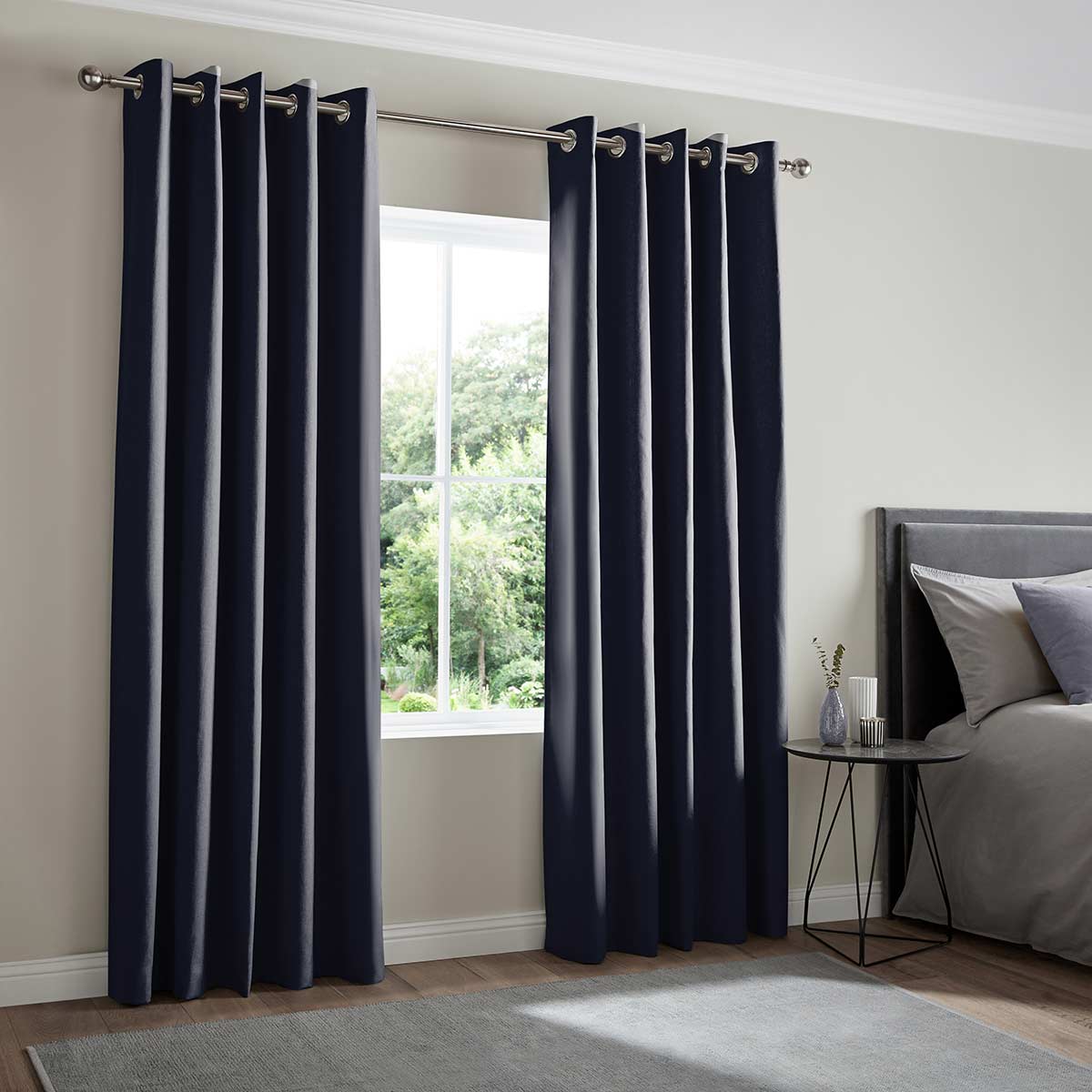 Eyelet - Eyelet curtains can only be fitted to poles. They have a metal ring stamped into the top of the fabric available in 5 colours and 2 sizes. Eyelet rings are spaced evenly across the header with 30mm of fabric above.