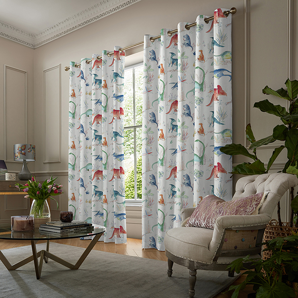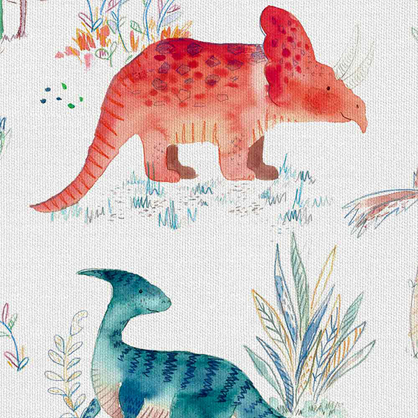 Featuring a collection of colourful dinosaurs illustrations in range watercolour hues, textured fabric cotton and linen finish to create the perfect lighting in your home., this design is available in a soft