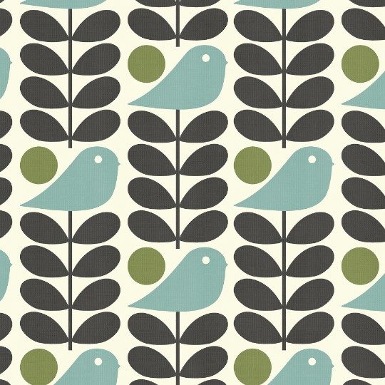 Featuring a repeating dark-grey and floral-inspired pattern interspersed with light blue, retro-styled birds, this design creates a bright and friendly feel in any room.