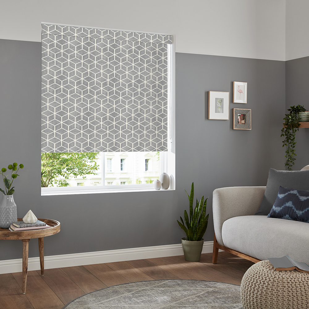 Enrich your room with geometric design roller blind in grey colour. Made with high-quality polyester that will last for years. Available with multiple base clothes to choose from.