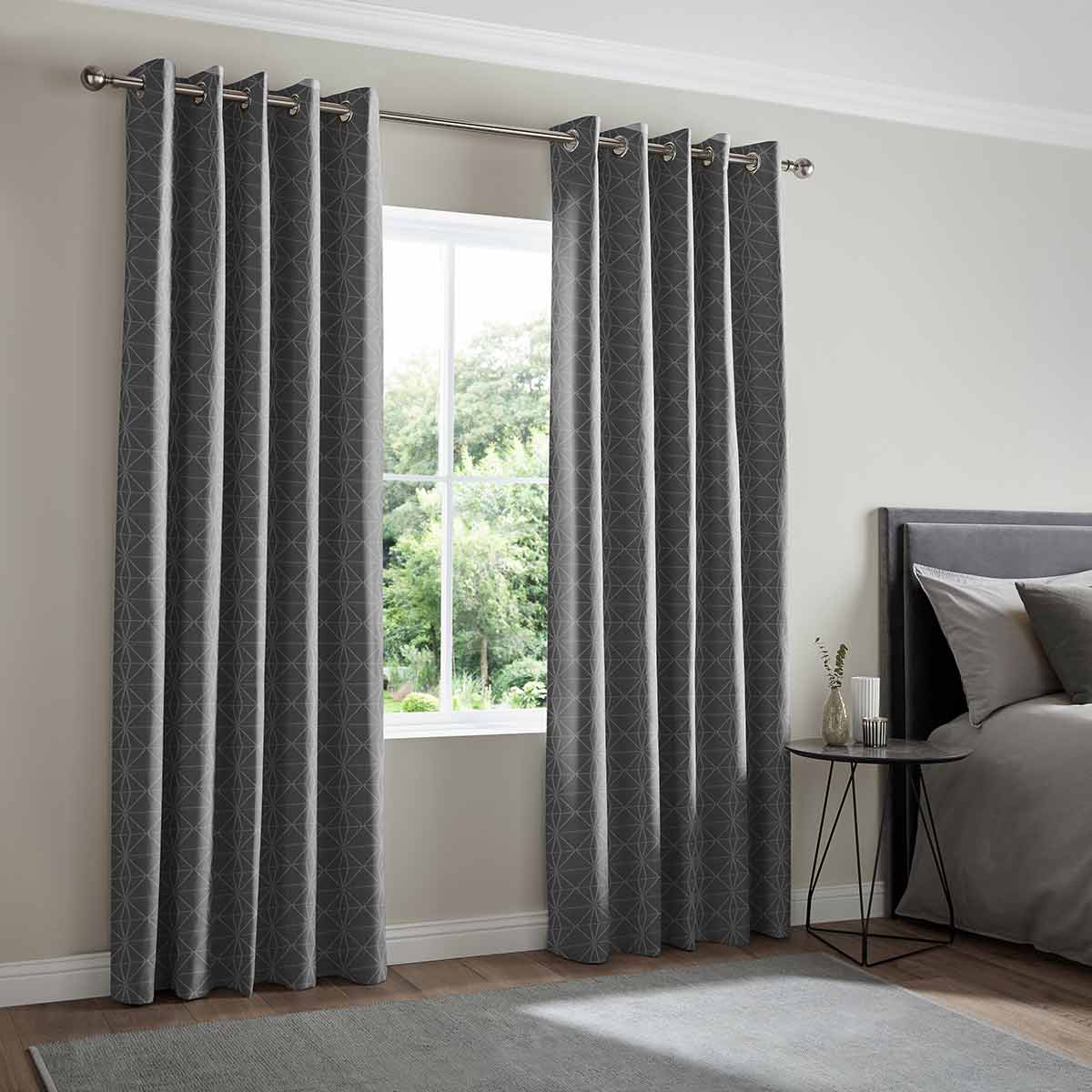Eyelet - Eyelet curtains can only be fitted to poles. They have a metal ring stamped into the top of the fabric available in 5 colours and 2 sizes. Eyelet rings are spaced evenly across the header with 30mm of fabric above.