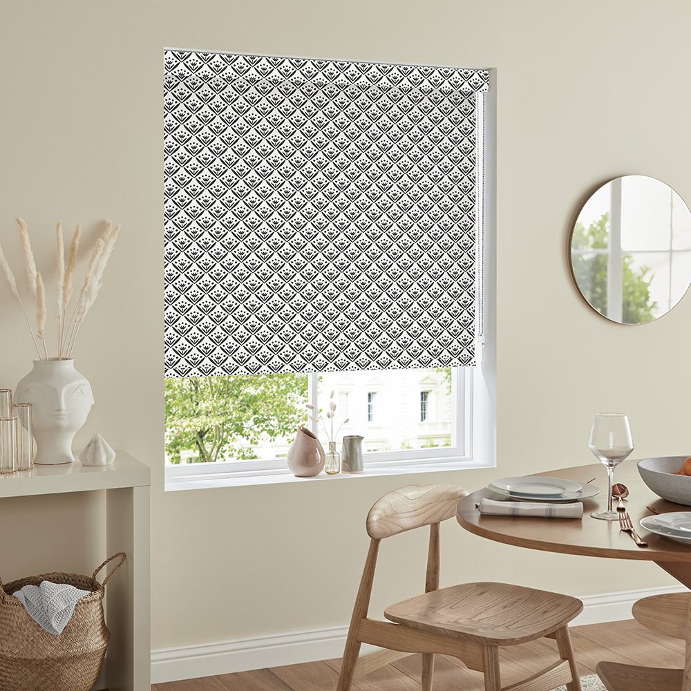 Enrich your room with this stylish geometric roller blind in black colour. The simple design looks clean and tidy on any window and is available in multiple base clothes to choose from.