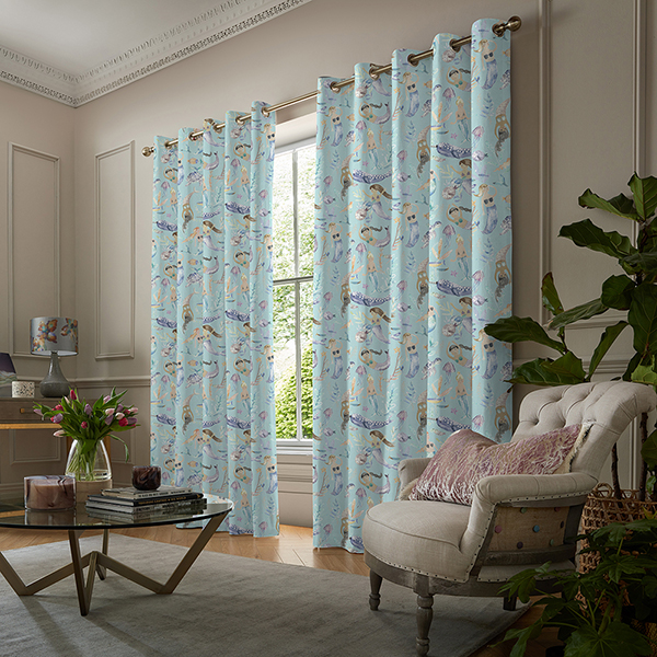 | Additional Information | Featuring a collection of colourful underwater illustrations of mermaids and sea life in a range of bright watercolour hues on an ocean-blue background, textured fabric cotton and linen finish to create the perfect lighting in your home., this design is available in a soft |