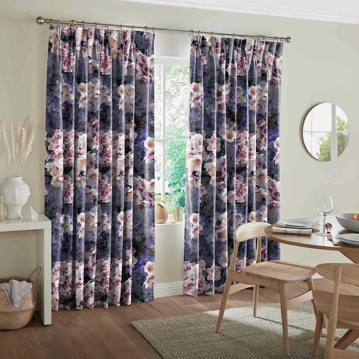 Featuring a realistic, watercolour floral pattern, this elegant design uses rich blue and pink hues to create a relaxed feel in any room.