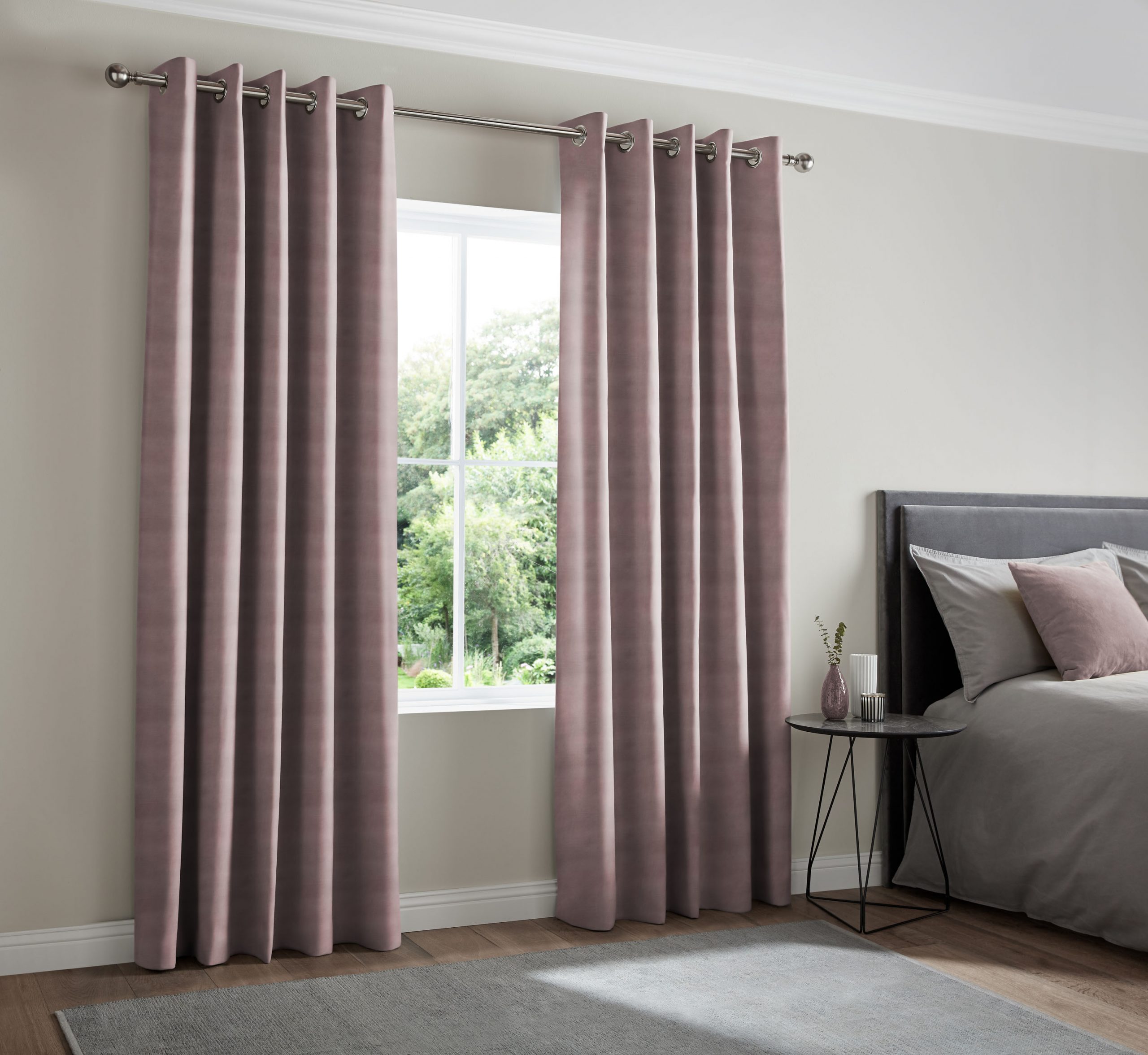Eyelet - Eyelet curtains can only be fitted to poles. They have a metal ring stamped into the top of the fabric available in 5 colours and 2 sizes. Eyelet rings are spaced evenly across the header with 30mm of fabric above.