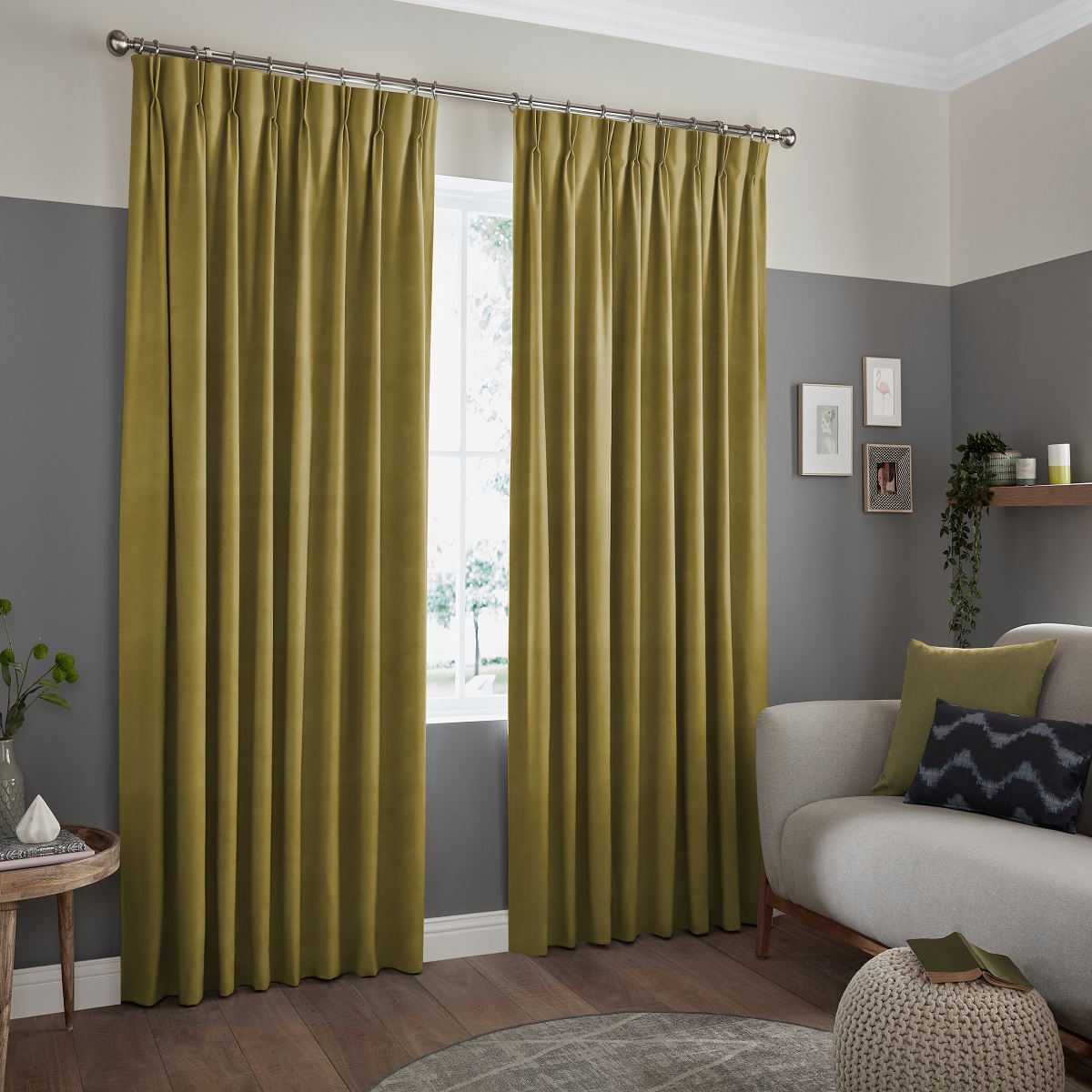 This soft velvet fabric has a luxuriously smooth texture and a natural lime-green hue that is perfect for creating a calm and relaxed style in any room.