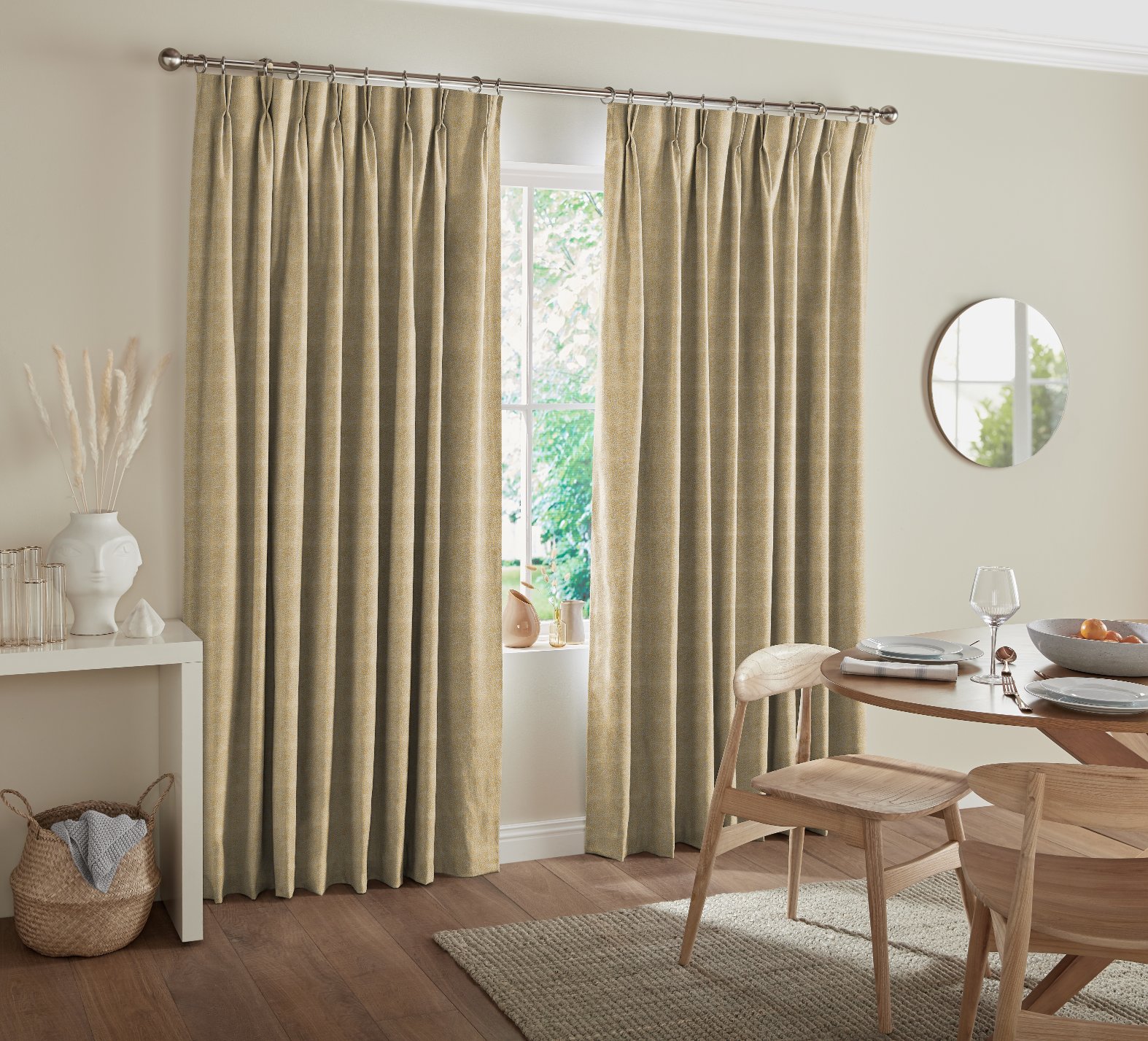 Double/Triple pinch pleat - Pinch pleat curtains can be fitted to a pole or a track. This header style has permenant sewn in pleats available in 4 inch or 6 inch sizes. A gliding hook at 100mm allows you to set the perfect position.