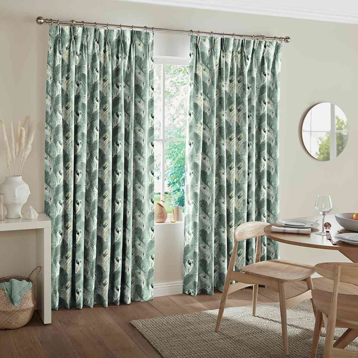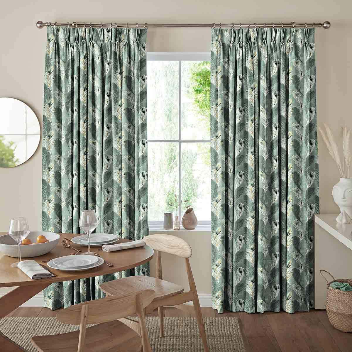 Vibrantly detailed contemporary peacock feather print in a striking spa colourway. Made out of pure cotton that will bring a touch of luxury to your room.