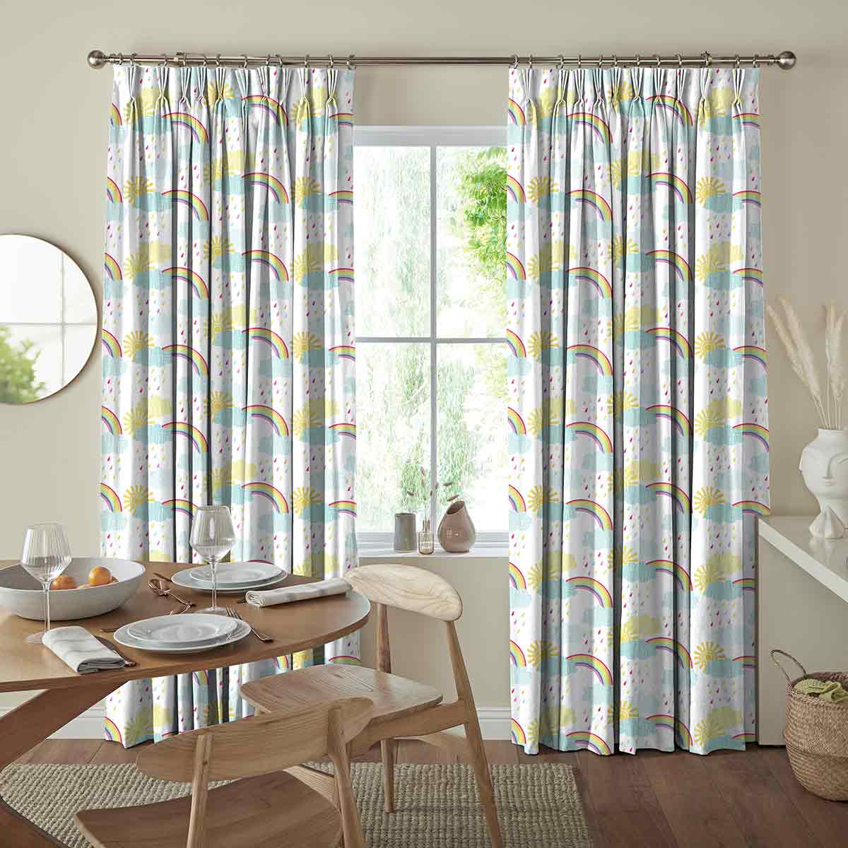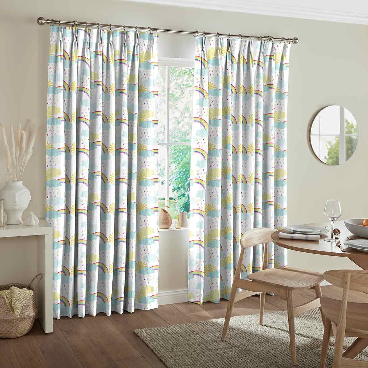 Featuring cute cartoon rainbow illustrations alongside bright suns and colour full rain drops, this design is perfect for adding a playful and friendly atmosphere into any child’s room.
