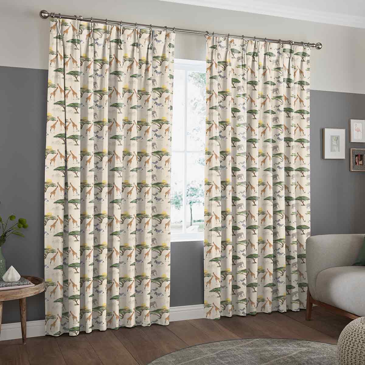 Featuring cute cartoon safari landscape illustrations in bright colours, this curtains design is perfect for adding a playful and friendly atmosphere into any child’s room.