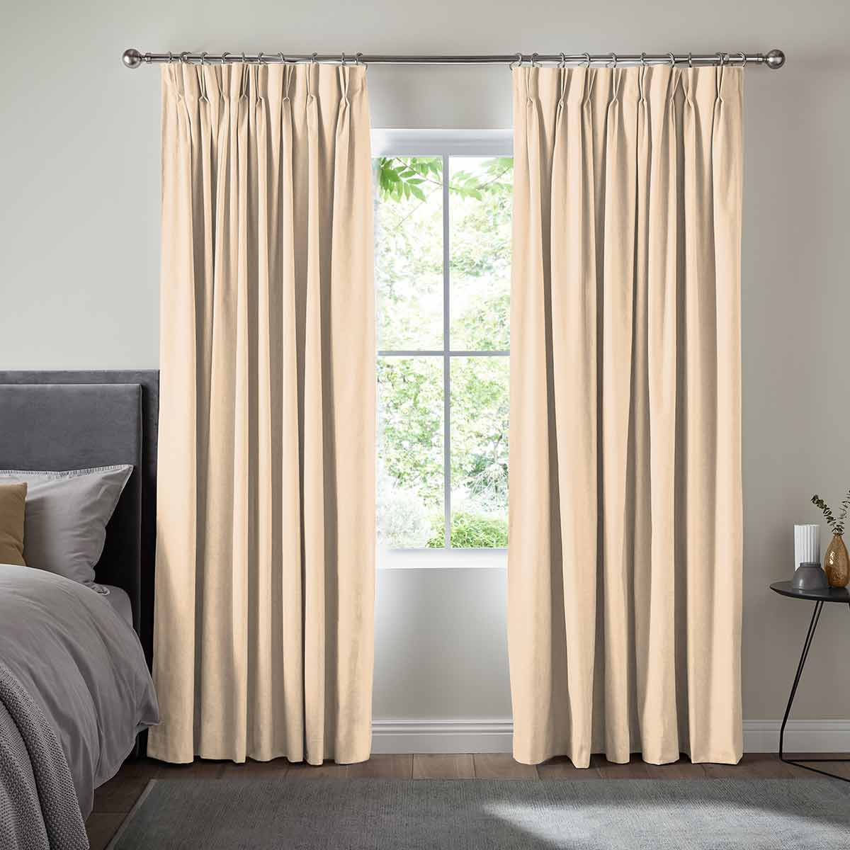 Double/Triple pinch pleat - Pinch pleat curtains can be fitted to a pole or a track. This header style has permenant sewn in pleats available in 4 inch or 6 inch sizes. A gliding hook at 100mm allows you to set the perfect position.