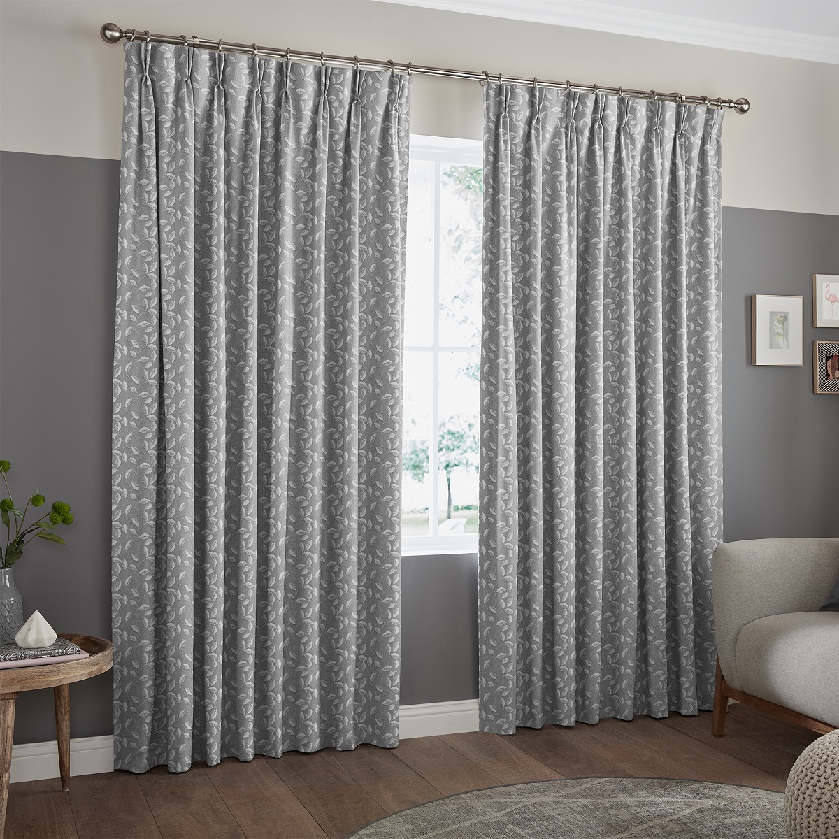 Timeless with a modern twist of matt and silk yarns, this small leaf trail jacquard weave works well for curtain in any room setting.