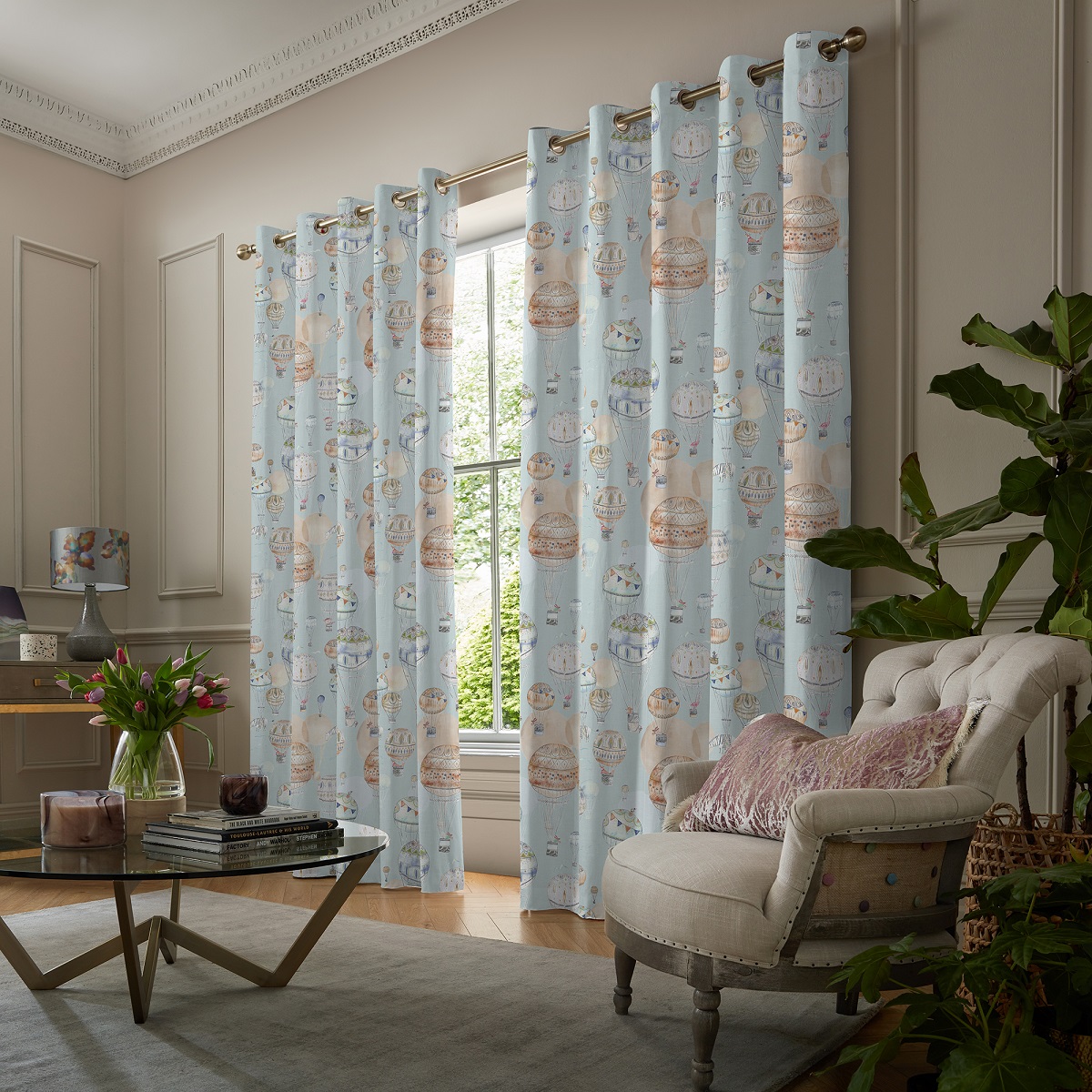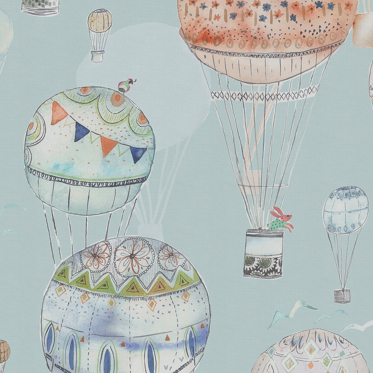 Featuring a collection of colourful underwater illustrations of hot-air balloons in a range of bright watercolour hues on a sky-blue background, this design is perfect for creating a playful and exciting feel for a child’s room.
