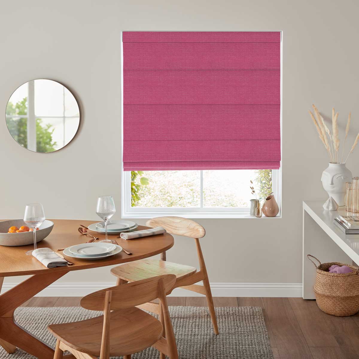 With its textured woven pattern, this fabric uses a vibrant pink hue with white highlights that can create a warming and playful energy for a cosy atmosphere in any room.